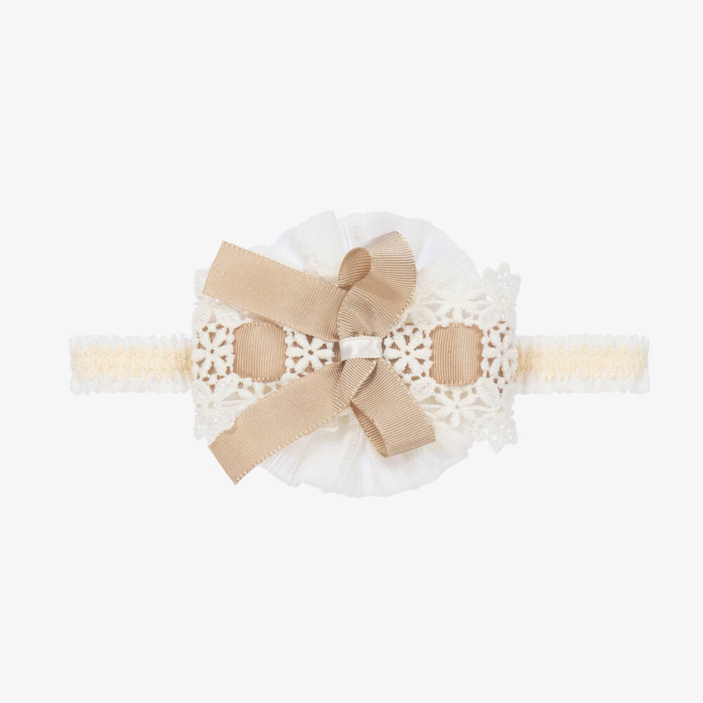 Lovely for a special occasion, this gorgeous ivory and beige headband for girls is by Miranda. The fabric rosette is trimmed with beautiful floral embroidered lace and topped with a grosgrain bow for a pretty finish. The narrow band is comfortably elasticated for a good fit.