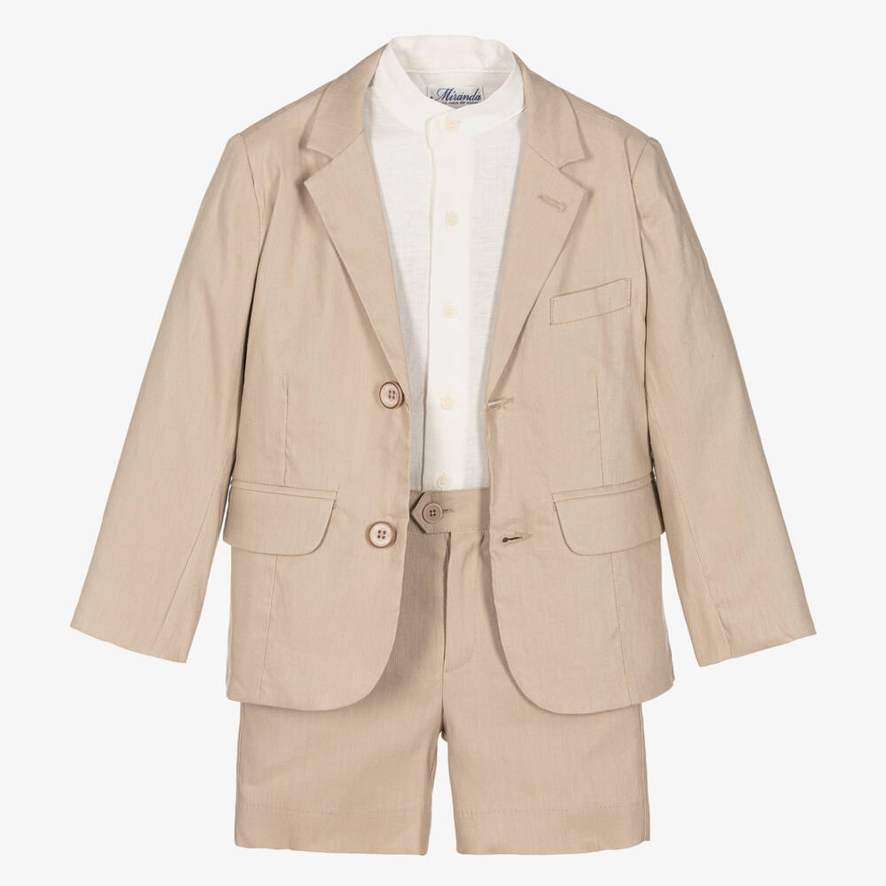 A lovely beige suit for boys by Spanish brand Miranda, made in a lightweight linen and cotton blend. Ideal for the warmer months, the single-breasted jacket is comfortably lined and detailed with notch lapels, flap front pockets, and a two-button front. There are decorative buttons on the cuffs and a charming pocket on the chest. The matching shorts are designed with pleated fronts, slanted pockets, and a button and zip fastening. The adjustable waist can be modified for a comfortable fit. Both can be styled with an ivory shirt, which has a standing collar and logo embroidery on the chest. There are added button fastenings on the sleeves so they can be rolled up and secured neatly.