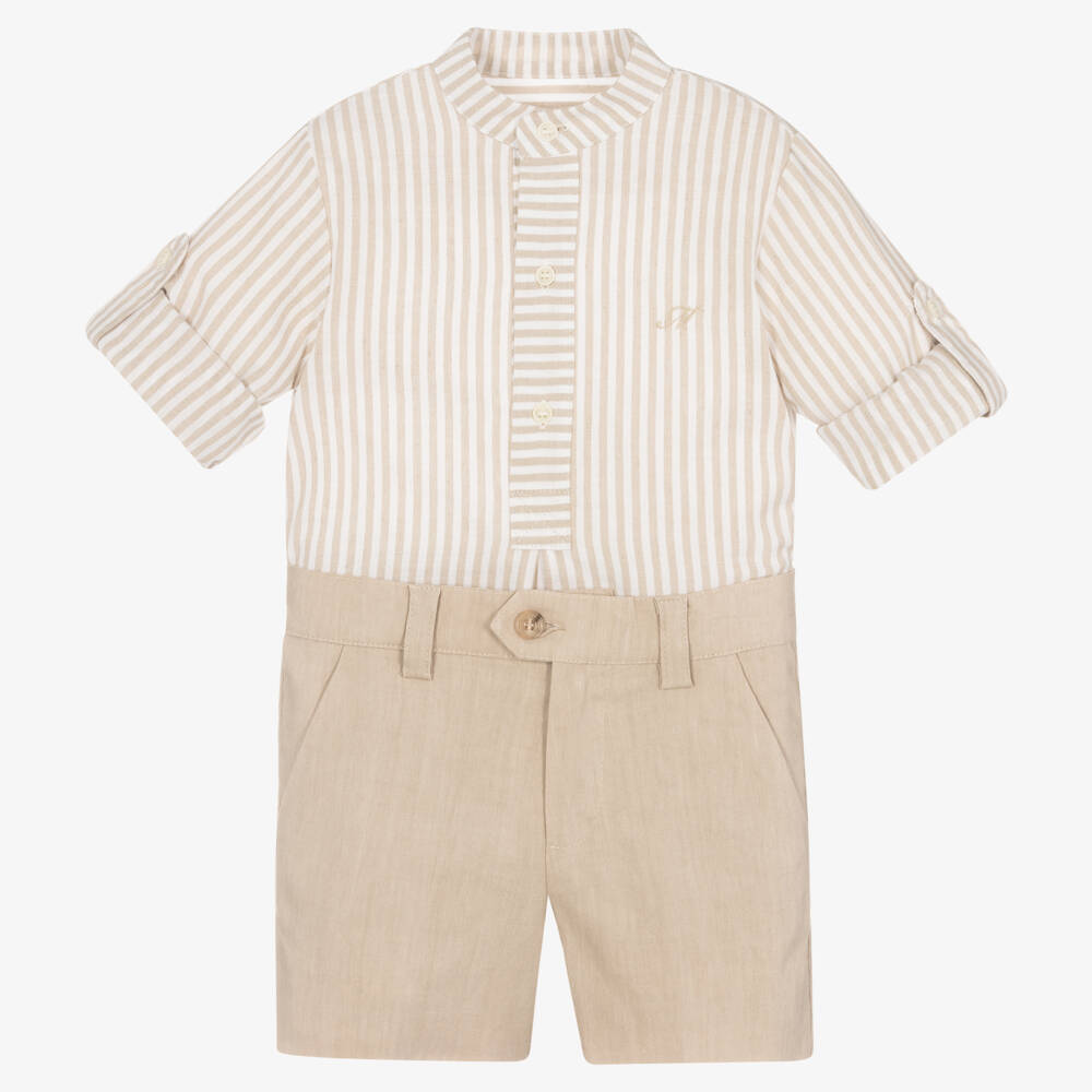 Boys smart shirt and shorts set by Spanish brand, Miranda. Made in a soft cotton and linen blend with a silky lining, the beige shorts have a button and zip fastening, belt loops, side and back pockets. The waistband is adjustable for comfort and fit. The matching off-white and beige striped shirt is collarless and has front button fastenings and buttons at the cuffs