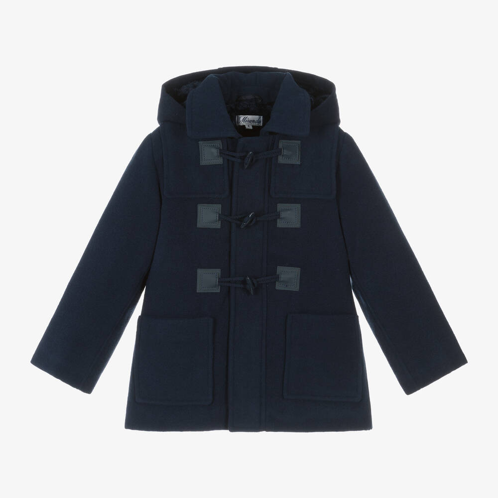Lovely for colder days, this navy blue hooded duffle coat for boys by Miranda is lined in warm and cosy plush. This traditional style has classic toggle fastenings on the front, with a smooth zip beneath to keep out cold chills. The hood is detachable with button fastenings on the sides for an alternative look.