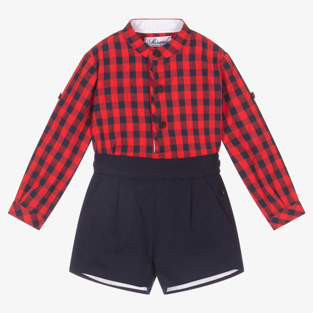 Smart red and navy blue cotton shorts set by traditional Spanish brand Miranda. The collarless shirt is made in red and navy blue gingham seersucker with button fastenings on the front, cuffs and sleeves to secure them when rolled up. Smart, lined, navy blue twill shorts complete the set, with a part-elasticated waist for a comfortable fit. They have useful jetted side pockets and fasten with buttons on the sides.