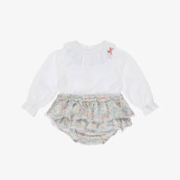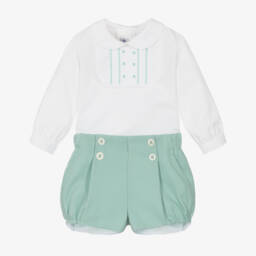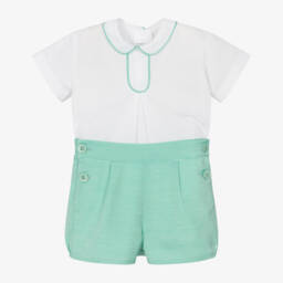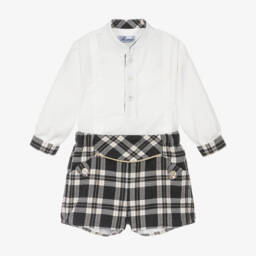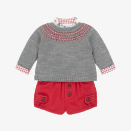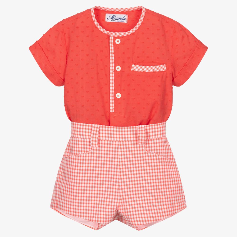 Little boys red shorts set by Miranda. This smart two-piece is traditionally styled, with a red, plumeti cotton shirt, trimmed in red and white gingham check. It comes with a pair of matching red and white checked shorts that fasten at the sides with buttons, are fully lined and have side cute pockets.