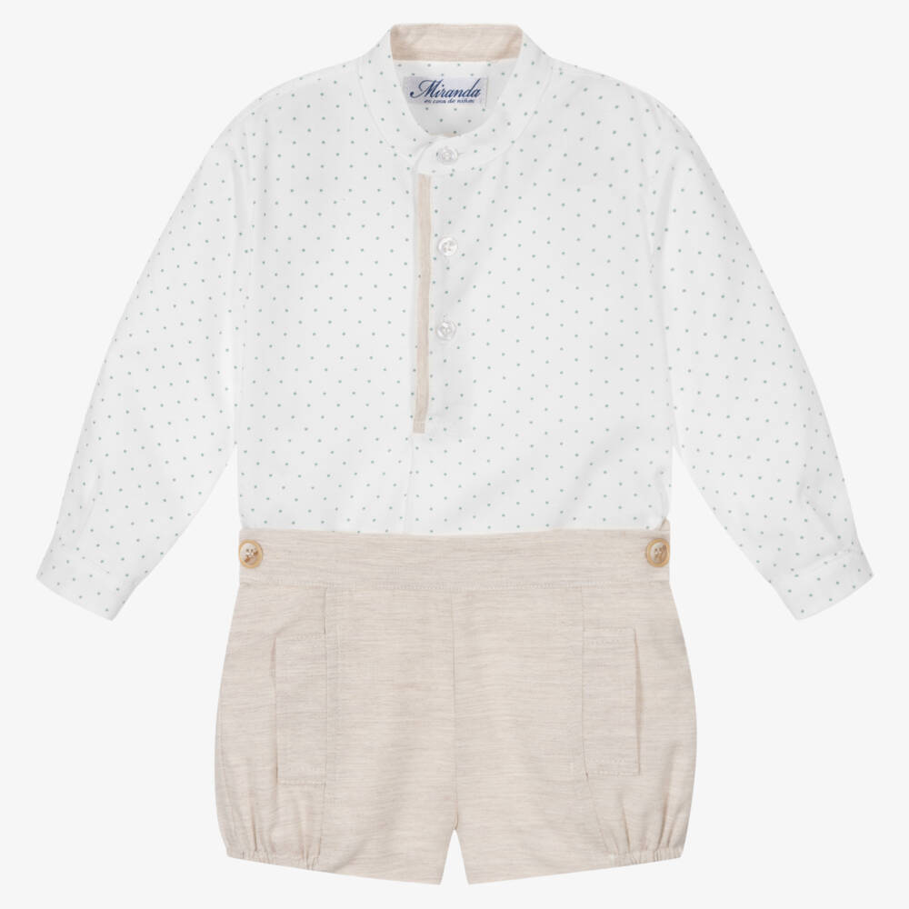 A smart-casual white shirt and beige shorts set for little boys by Miranda. Made in soft twill, the collarless shirt has a green dot pattern, with a beige-trimmed upper button placket. The woven cotton shorts are fully lined and partly elasticated around the waist and legs for a comfortable fit. They have concealed pockets on the front and fasten with buttons at the sides.
