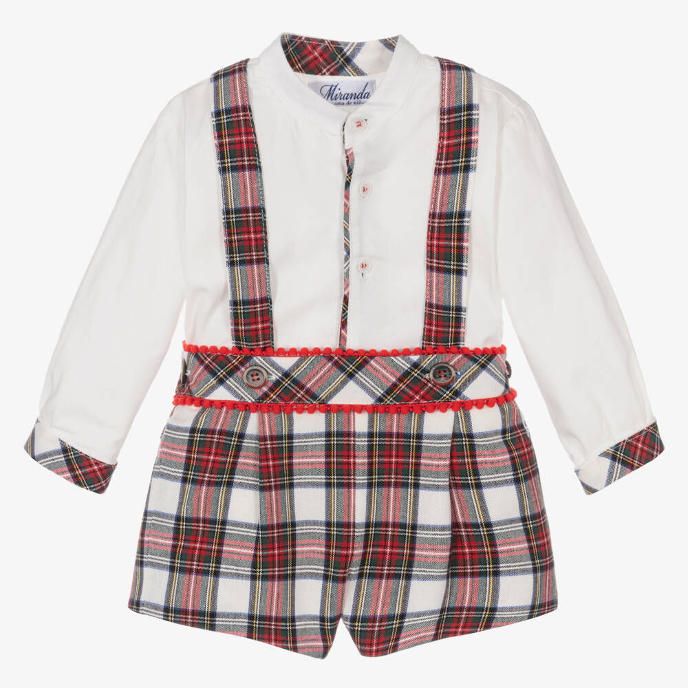 Boys White & Red Tartan Shorts Set