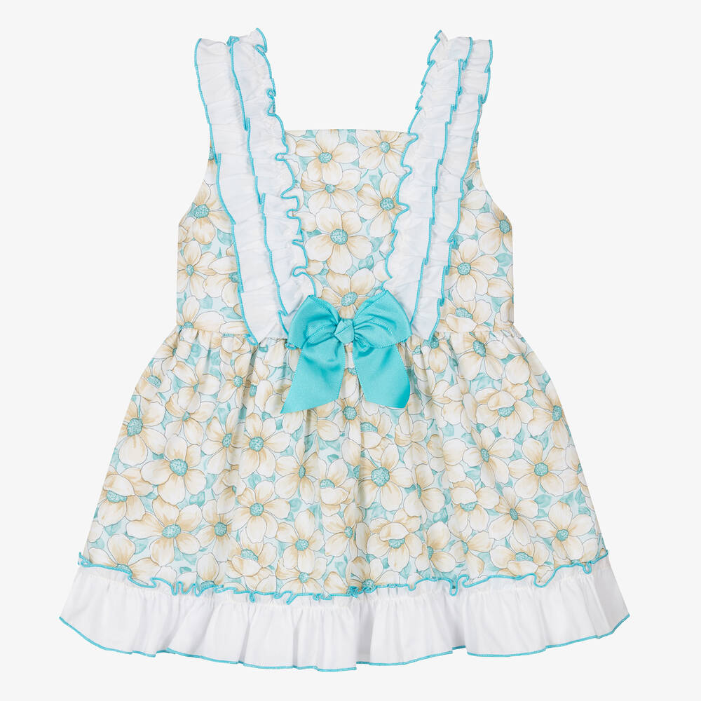 A lovely, sleeveless poplin dress for girls by Miranda, with a charming turquoise blue and beige floral print. It is made in a soft and lightweight cotton blend, with white ruffle trims edged in turquoise blue on the shoulders, bodice and hem. A grosgrain ribbon bow on the front gives it a pretty finish. Fully lined in lightweight voile for comfort, this lovely dress fastens neatly on the back with buttons.
