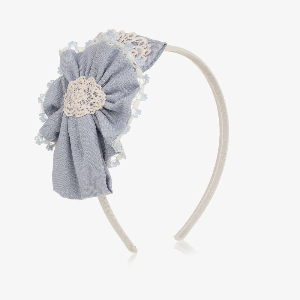 A lovely pale blue and ivory hairband for girls from Miranda. The flexible, slim band is covered in ivory fabric. There is a beautiful pale blue rosette bow trimmed with delicate ivory laces, adding a pretty finishing touch to any outfit.