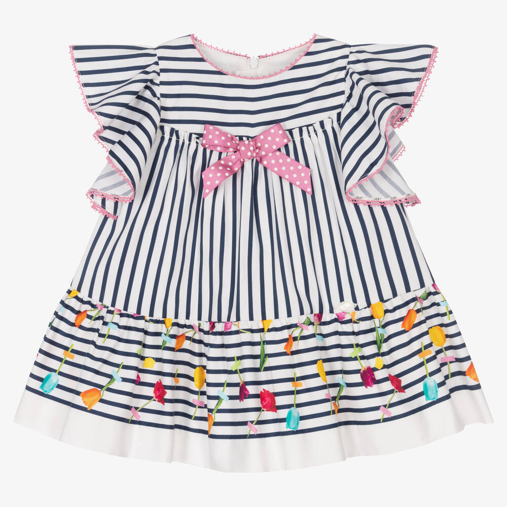 A navy blue and white striped dress for girls by Spanish brand Miranda, made in a soft and lightweight cotton weave. Designed with large flutter sleeves, it has contrasting pink picot trims with a lovely pink polka dot bow on the waist. Fully lined in soft voile, the lower tiered layer is scattered in beautifully bright tulips for a feminine finish.