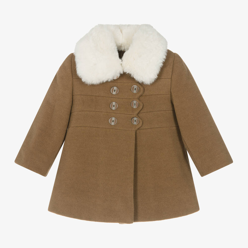 Smart brown coat for girls by Spanish brand Miranda, made from softly felted fabric with a satin lining. A traditional double-breasted style, it has a removable, ivory faux fur collar and an inverted pleat with a half-belt tab on the back. There are neat, concealed side seam pockets and scalloped trim on the front adds a pretty finishing touch.