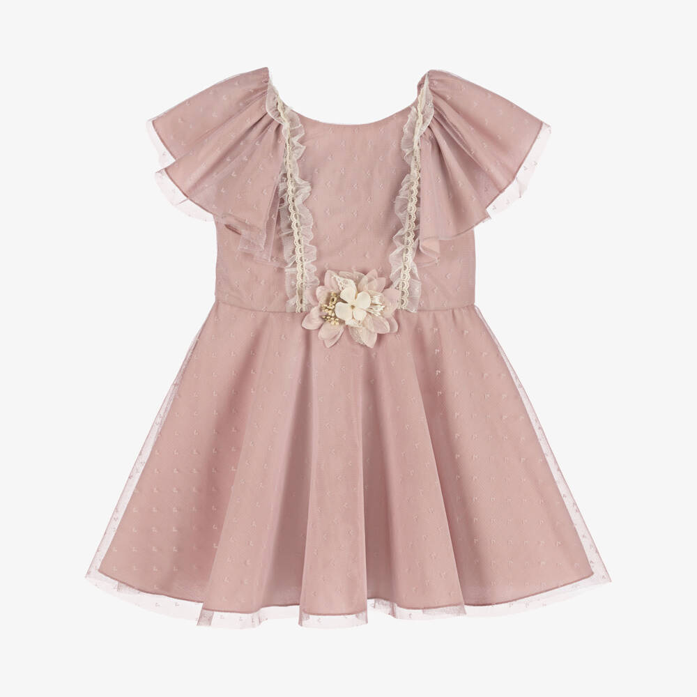 Beautiful dusky pink dress for girls by Miranda, ideal for a special occasion. Made in a lightweight cotton blend with an embroidered tulle overlay, this elegant fit and flare style has a charming ruffle trim which extends over the shoulders and around the back. Ivory tulle and lace decorate the front, with a delightful, popper-fastening floral detail on the waist. For a neat finish, there is a concealed zip on the back.