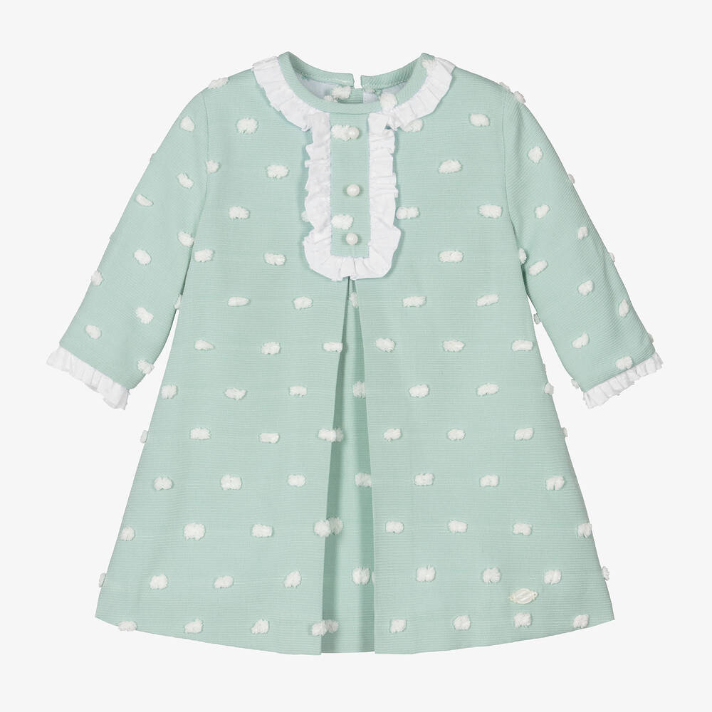 Sweet mint green dress for girls by Miranda, dotted with fluffy white pom-poms. Trimmed with white cotton ruffles, it has smart inverted pleats on the skirt and pearlised, decorative buttons on the chest. It is fully lined for comfort and fastens with buttons on the back. A white plumeti bow appliqué on the back completes the look.