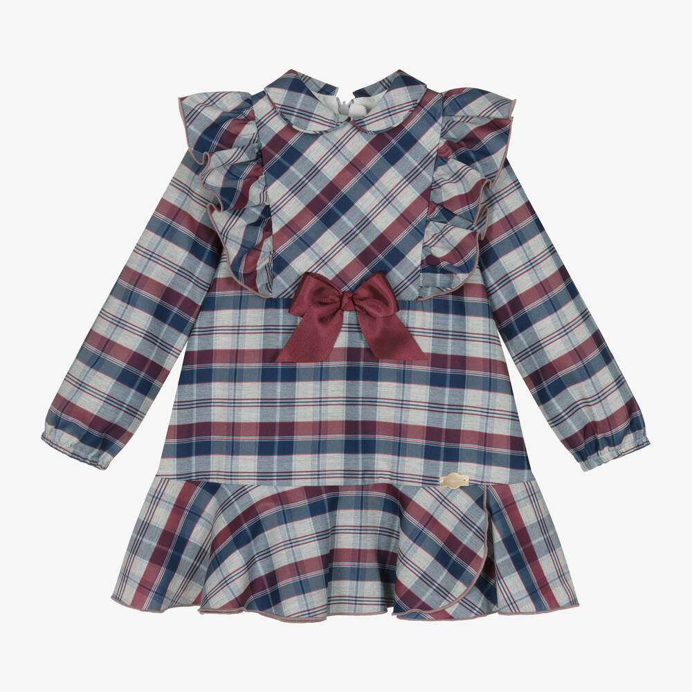 Girls grey cotton-blend dress by Spanish brand Miranda, with a lovely navy blue and burgundy red tartan design. Soft and lightweight, the dress is traditionally styled with a little collar and ruffle trims. It has a decorative grosgrain bow stitched on the front and a wrap-effect hem, detailed with a logo charm for a discreet designer touch. Lined in lightweight voile for comfort, the dress fastens neatly on the back with a concealed zip.
