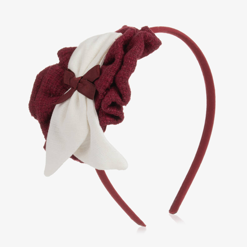 Beautiful burgundy red and ivory hairband for girls from Spanish brand, Miranda. An ideal finishing touch to her outfit, it features a softly woven burgundy rosette with ivory ribbon trim and a grosgrain bow at the centre, set on a flexible narrow hairband.