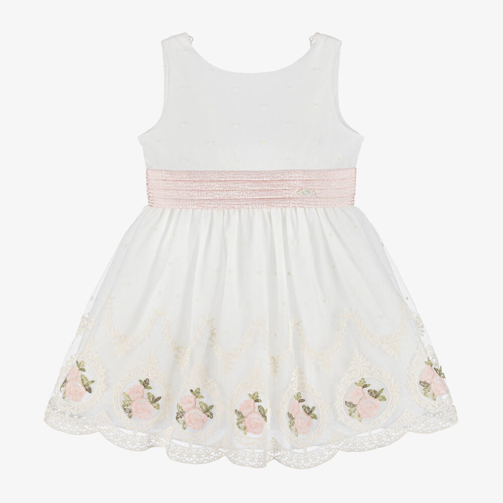 Beautifully embroidered ivory tulle dress for girls by Spanish brand Miranda, just right for a special occasion. Soft and lightweight, the bodice is embroidered with polka dots and has lovely embroidered tulle trims on the back. The pink jacquard, cummerbund-style waistband has a pearlised logo charm sewn on one side, whilst the skirt is embroidered with pink roses and has a pretty scalloped hemline. The dress is fully lined in voile for comfort, with a frilled layer for extra volume, and fastens with a concealed zip on the back.