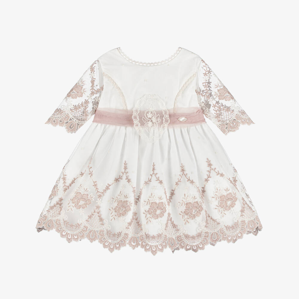 Gorgeous ivory and pink special occasion dress for girls by Miranda, with a beautifully embroidered, floral tulle overlay and elegant, sheer sleeves. It has scalloped, embroidered trims and a fixed, gathered sash on the waist, with a bow on the back. The comfortable lining has a frill and a net layer to give lots of extra volume.