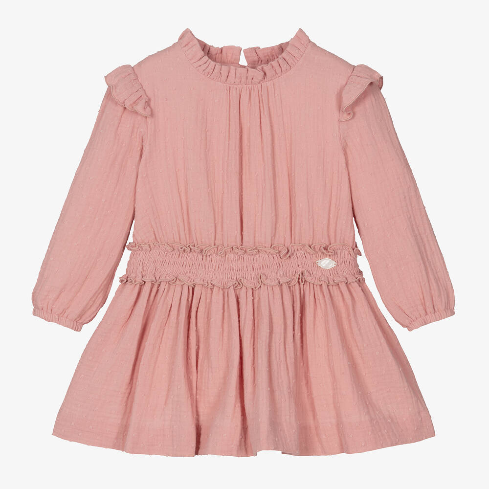 Pink dress for girls by Spanish brand Miranda, made in soft cotton muslin patterned with plumetis. This sweet, long-sleeved dress has ruffle trims over the shoulders and around the neck. It is fully lined for comfort and added volume on the skirt. The waistband is shirred for style and a lovely fit, with a logo charm on the front. It fastens with a pretty flower-shaped button on the back.