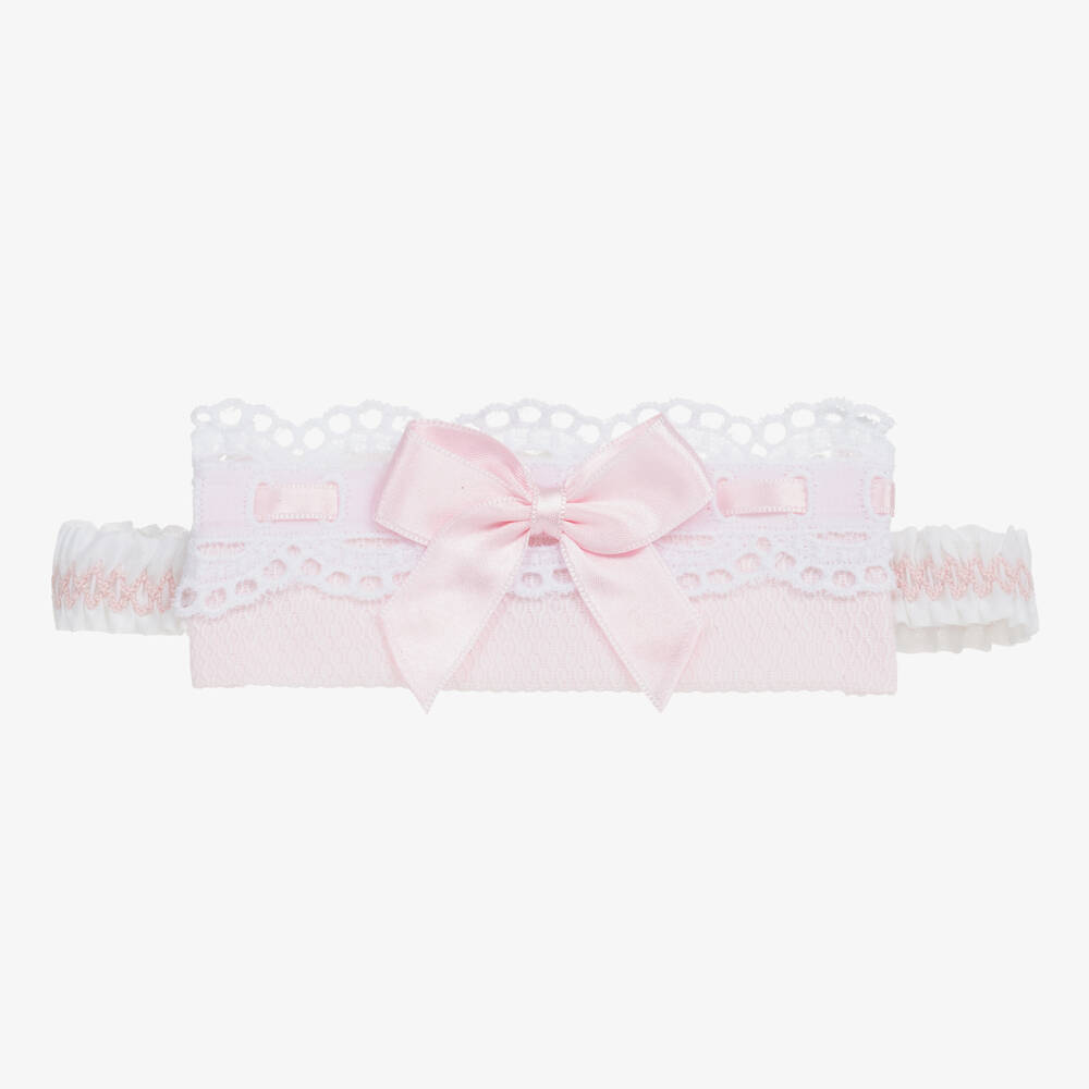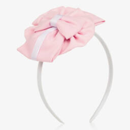 A lovely pink and white headband for little girls by Miranda. Sweet and adorable, the front panel is decorated with a pretty broderie anglaise trim and a silky satin ribbon bow, for a girly finish. Made from smooth woven fabric, the shirred elasticated band has embroidered detailing for an added touch of femininity.