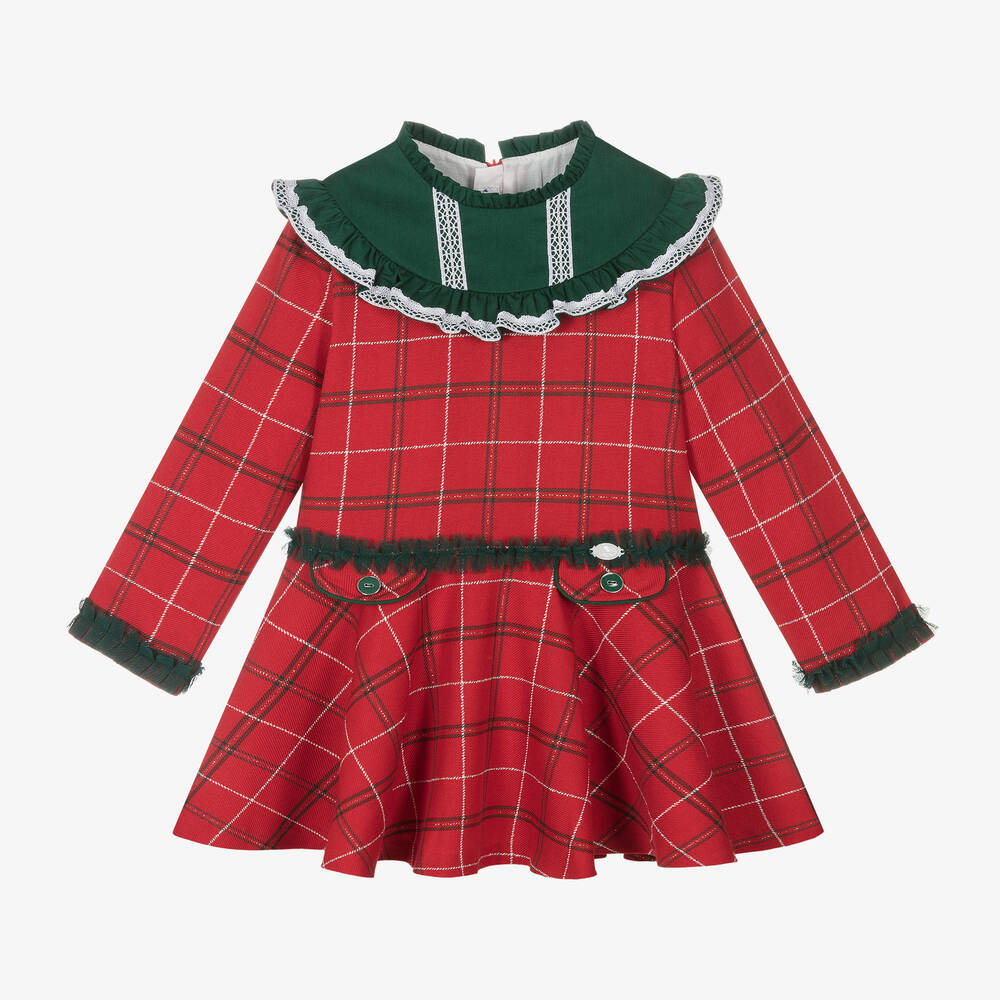 A lovely red and green checked dress for girls by Miranda, made in soft cotton and viscose blend twill with silver thread for a subtle shimmer. It has a flared skirt, green tulle trims, faux pockets and a logo charm decorating the waist for a pretty finish. Fully lined in lightweight voile for comfort, the dress fastens neatly on the back with a concealed zip.