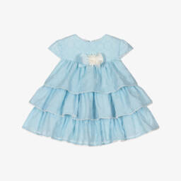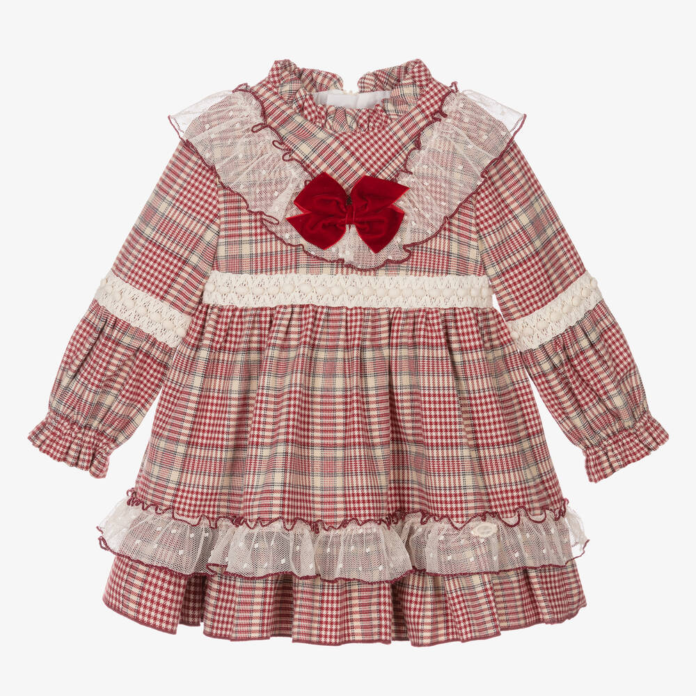 Stunning red and ivory cotton dress for girls by Miranda, woven in contrasting checks. The beautiful design is accentuated with ivory macramé trims and cute pom-poms. Delicate dotty tulle ruffles, pretty frills, and a red velvet bow on the front finish off the girly look. It is lined in soft voile for comfort and fastens with a concealed zip on the back. The brand's pearly logo tab is sewn on the front near the hem.
