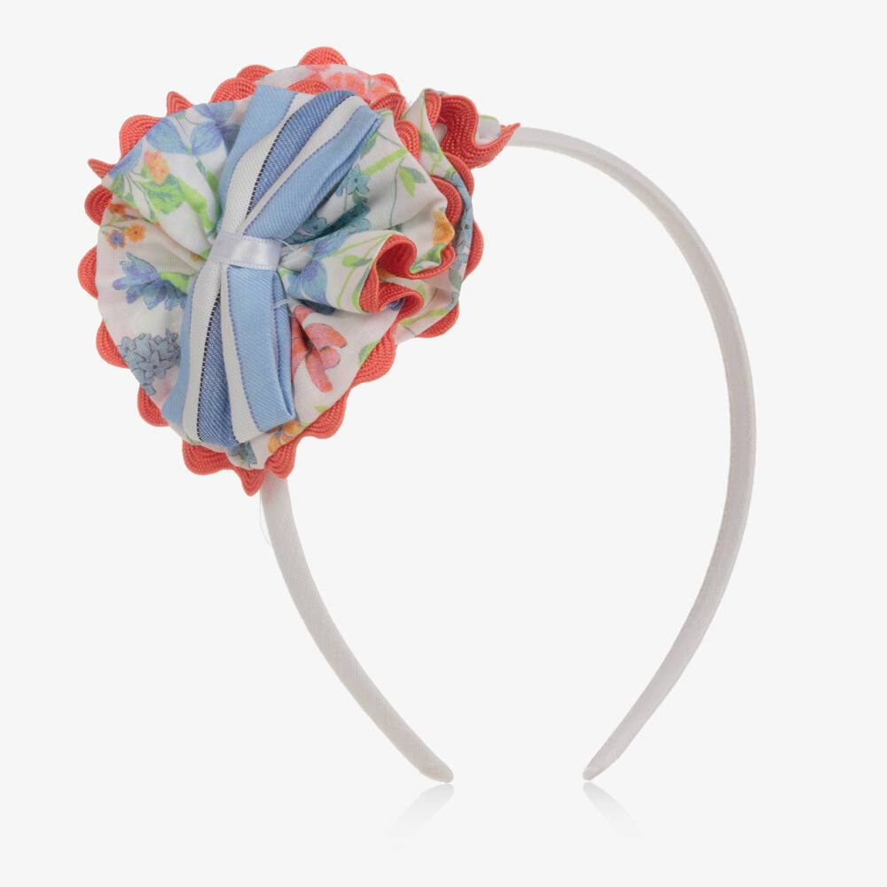 A lovely white hairband for girls by Miranda, decorated with a floral-patterned rosette. A versatile accessory, the layered rosette is finished with pink ric rac trims and a two-tone blue and white chevron stripe bow.