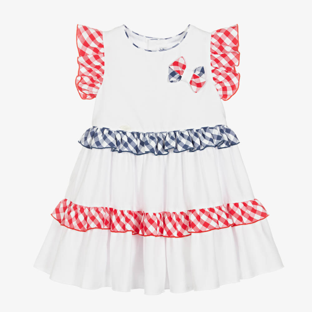 A lovely white cotton dress for girls by Miranda, traditionally styled with classic red and navy blue gingham check trims. Lightweight and super soft, it has pretty flutter sleeves with a matching bow appliqué on the chest. Fully lined, it has red button fastenings on the back and a ruffled trims on the skirt for a feminine finish.
