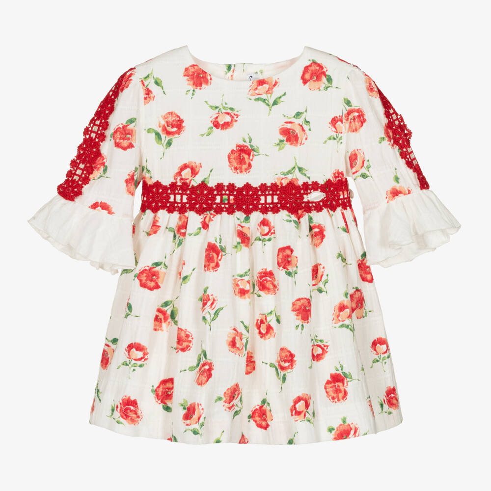 Designed by Miranda, this white dress for girls is woven in lightweight cotton. Printed with pretty red roses, it has sweet embroidered embellishments on the front and down each frilled sleeve. Lined in lightweight voile, there are lovely ties and button fastenings on the back.