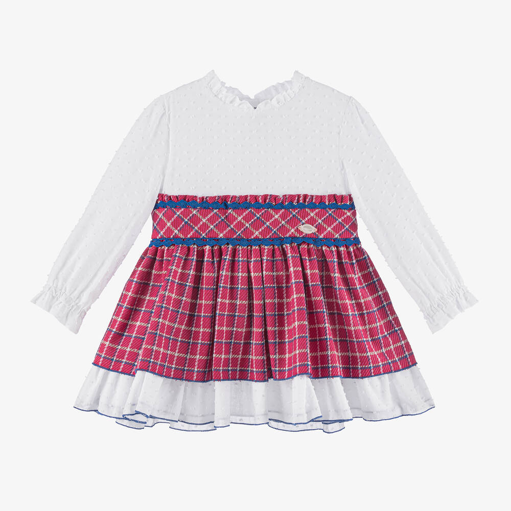 A charming white and pink dress for girls by traditional Spanish brand, Miranda. Made in soft and lightweight cotton plumeti with lovely ruffle trims, this long-sleeved style has a pink and blue checked overlay on the skirt with embroidered blue trims and a logo charm on the front. There are contrasting blue buttons to fasten on the back, together with a pretty bow detail that secures with a button.