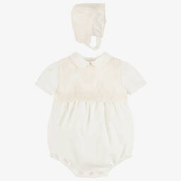 Traditional ivory babysuit set for boys and girls by Miranda, woven with a delicate waffle texture. The long-sleeved shortie has a picot-trimmed collar and charming lace details. It is lined for comfort and fastens with buttons on the back and between the legs. A matching bonnet completes the sweet, classic look.