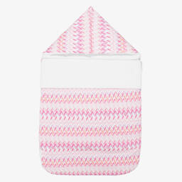 Baby girls pink, white and lilac nest by luxury Italian designer Missoni, patterned in the label's signature zigzags and logos for instant brand appeal. Made and lined in soft cotton jersey, it is lightly padded for cosiness and fastens with an easy-to-use zip on one side and along the base. As baby grows, the hood can be unfastened and opened out flat.