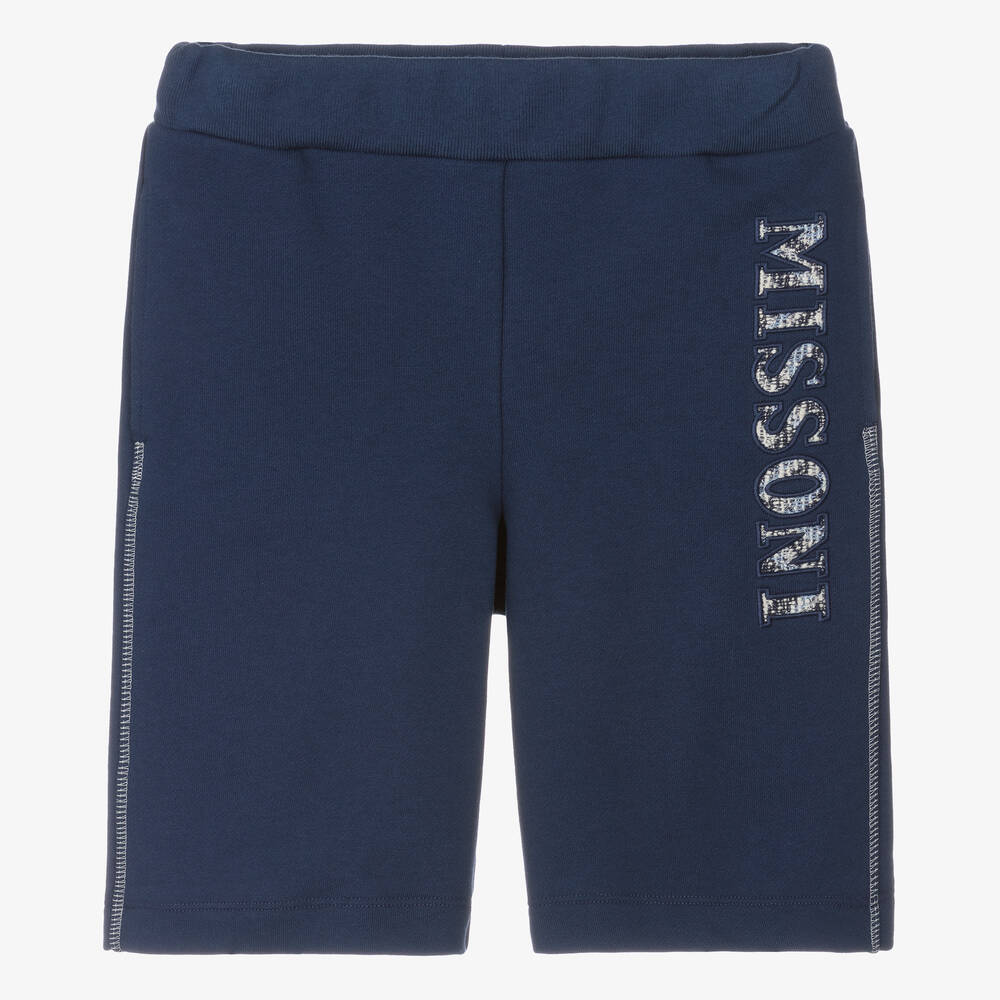 Boys navy blue cotton shorts undeniably by Missoni, with a bold tweed logo emblazoned on one leg in shades of blue. Bermuda length, they are made in soft, comfortable jersey with white overstitch detailing and useful side seam pockets.