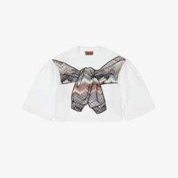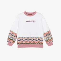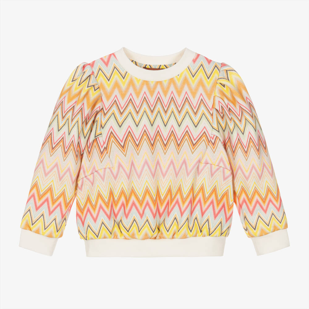 Patterned in the designer's iconic zigzag pattern in shades of pink, orange and yellow, this colourful sweatshirt for girls is by luxury Italian brand Missoni. Casual and comfortable, it is made in mid-weight cotton jersey, in relaxed boxy fit. There are pretty puffed sleeves with ivory ribbed trims for a cosy feel.