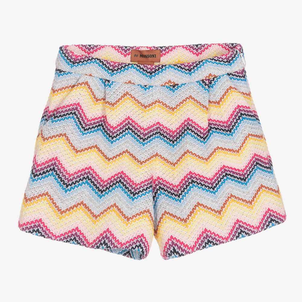 Stylish and vibrant shorts for girls by Italian designer Missoni. Instantly recognisable, they are beautifully knitted in the brand's signature zigzag pattern, in a colourful, soft cotton blend yarn. Fully lined for comfort, they have a lovely, soft pleated front, slanted front pockets and invisible side zip fastening for a neat finish. The waist is adjustable for a good fit.