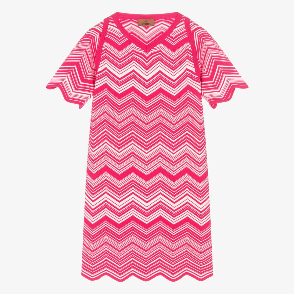 Magenta pink and white dress for older girls by luxury brand Missoni, knitted in a soft viscose blend. Designed in the Italian label's iconic zigzag pattern, this casual dress has short raglan sleeves and a gently ribbed V-neck. The scalloped trims on the hem and cuffs add a stylish finish.