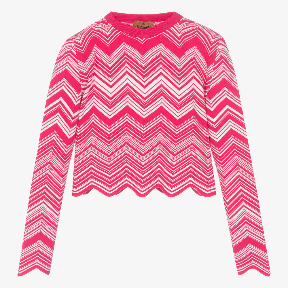 Magenta pink and white sweater for older girls by luxury brand Missoni, knitted in a soft viscose blend. Designed in the Italian label's iconic zigzag pattern, this boxy top has long sleeves and a gently ribbed crew neck. The scalloped trims on the hem and cuffs add a stylish finish.