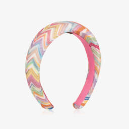 Beautiful padded hairband for girls by Missoni, showcasing the Italian label's distinctive Zigzag pattern in shades of pink, black, grey and beige. Knitted in silky viscose, the flexible band has a grosgrain ribbon lining to help it stay in position. This stylish hairband complements any outfit, offering a chic accessory for every occasion.