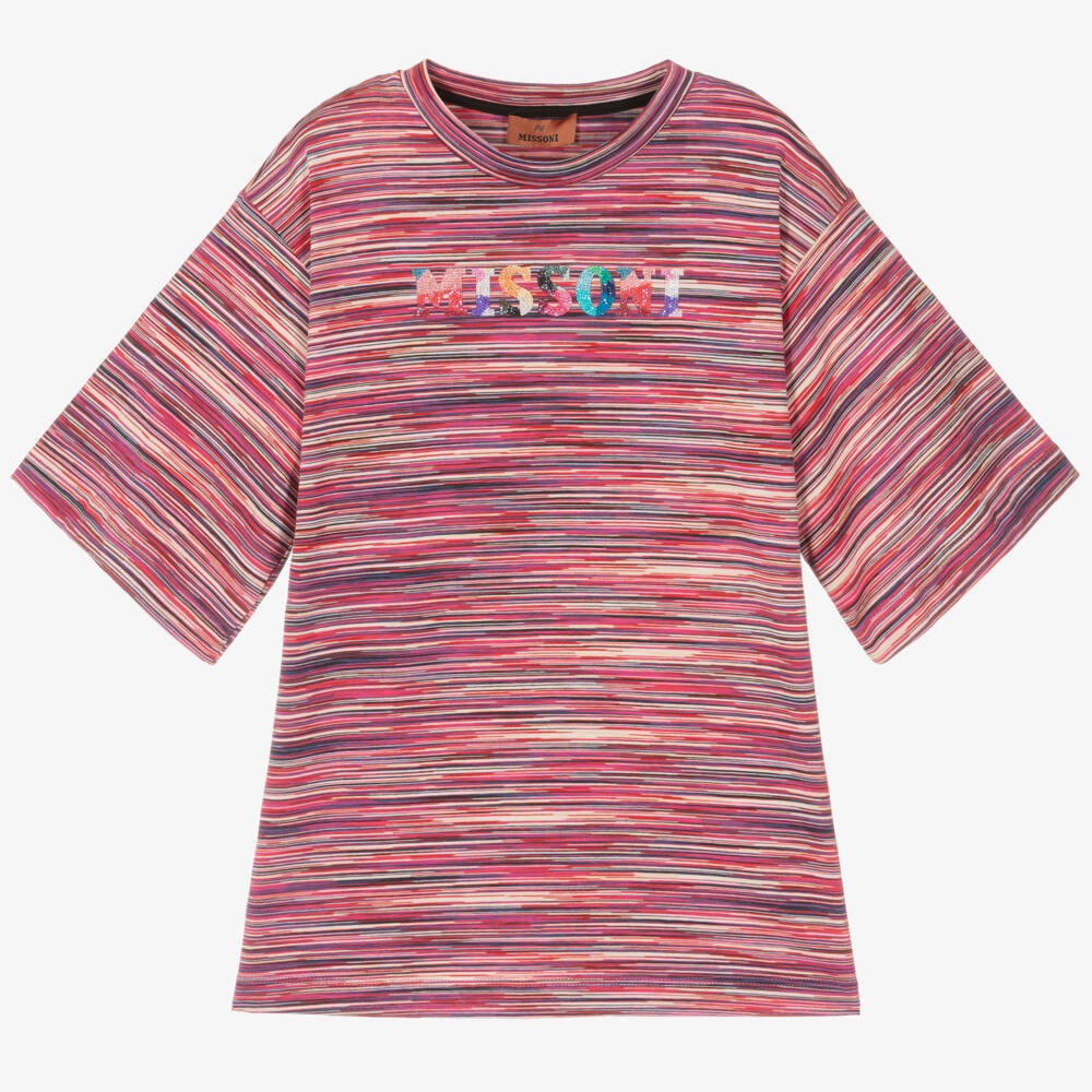 Girls cotton jersey dress by luxury Italian brand Missoni, designed in complementary pink, blue and ivory stripes. Great for casual wear, this colourful piece has dropped shoulders and wide, three-quarter length sleeves for a relaxed silhouette. The multicoloured logo on the front is embellished with iridescent beads which shimmer beautifully in the light.