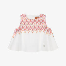 Stylish pink blouse for girls by luxury designer, Missoni. Made in the label's signature zigzag knit, it has a pretty halter neck style and floaty design. Soft cotton lines the style for comfort, and a hidden zip on the back fastens the piece with a seamless illusion.