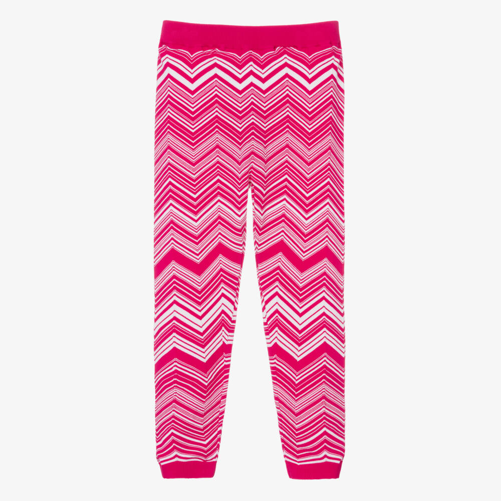 Bold pink and white trousers for older girls by luxury Italian brand Missoni, knitted in a soft and lightweight viscose blend. Featuring the designer's instantly recognisable zigzag pattern, these trousers are a stylish option for statement wear. They have a stretchy ribbed waistband and cuffed ankles to create a relaxed silhouette.