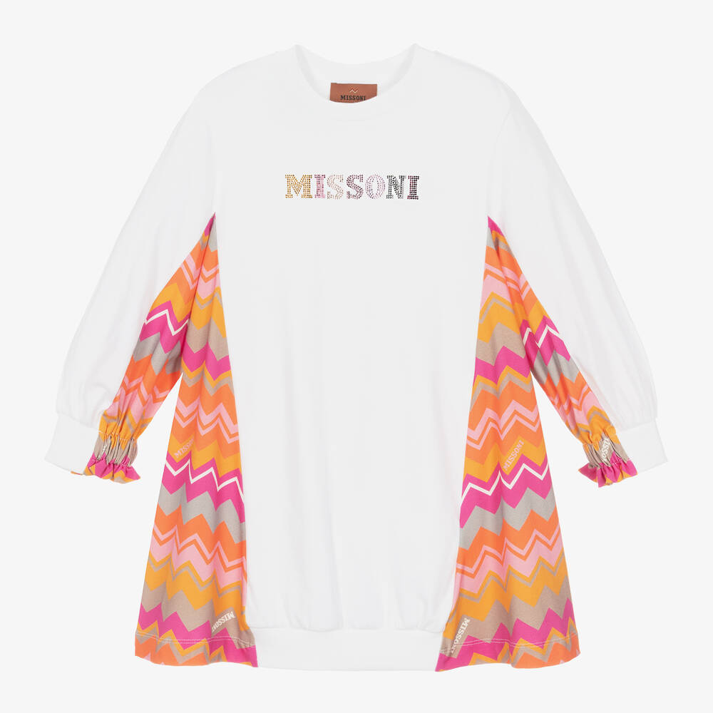 A white cotton jersey dress for girls by luxury Italian label Missoni. In shades of pink and orange, it is trimmed with the designer's signature zigzag pattern along the long sleeves and down the sides. This casual style has ribbed trims on the ruched cuffs and on the flared hem, and simply pulls on over the head. It is finished with a sparkly diamanté logo across the front.