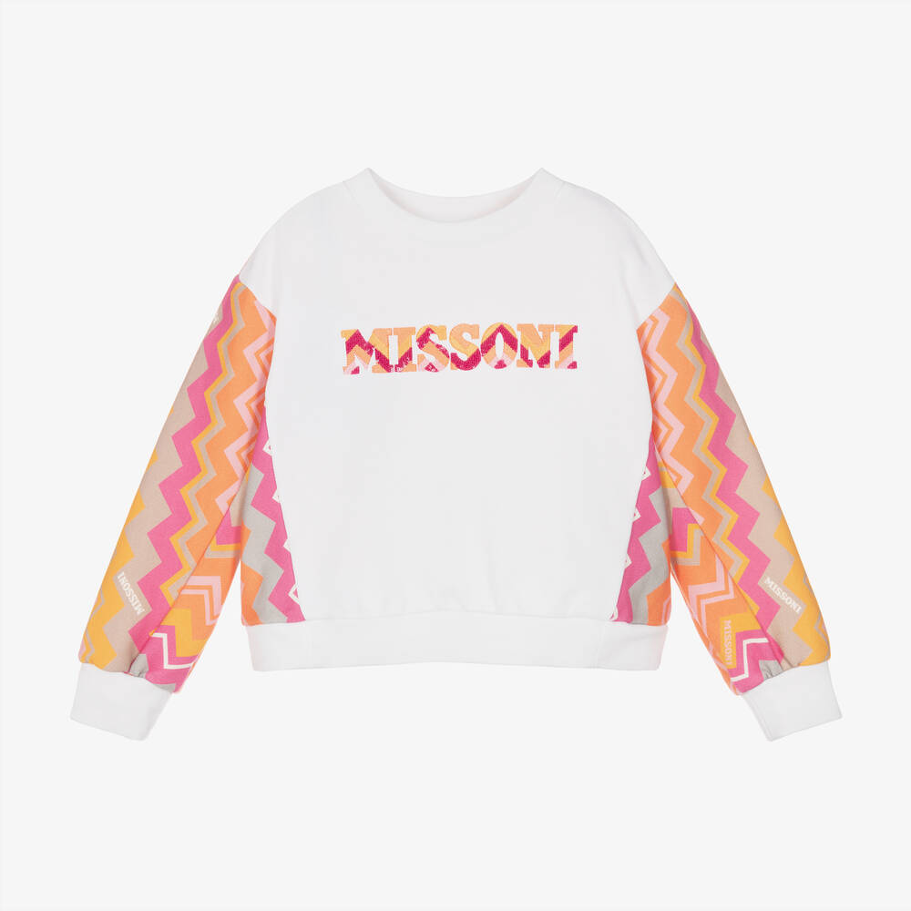 A white cotton jersey sweatshirt for girls by luxury Italian brand Missoni. In shades of pink and orange, it is trimmed with the designer's signature zigzag pattern along the long sleeves and down the sides. This casual style has a relaxed boxy fit, with cosy ribbing around the neckline, cuffs and hem. It is finished with an embroidered and sequinned logo across the front.