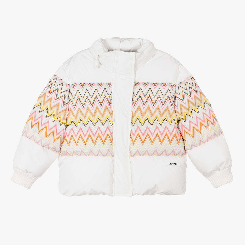 A stylish white puffer jacket for girls by Italian designer Missoni, patterned with the luxury brand's iconic zigzag pattern in shades of pink, orange and yellow. Made in a silky, smooth fabric and down-padded for superior warmth, it has knitted ribbed cuffs and fleece-lined pockets concealed in the side seams. For extra protection, a fixed hood zips away easily into the high neck when not in use. The jacket fastens with a zip on the front, hidden beneath a popper fastening placket and for a signature finish, the brand's logo patch is stitched on the front.