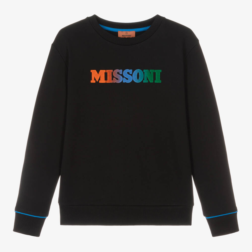 Casual black sweatshirt for teen boys by luxury Italian label Missoni. Adding a splash of colour, the brand's flocked logo is displayed on the chest in a gradient of orange, blue and green. This comfy top is made in organic cotton jersey, with blue piped details on the cuffs.