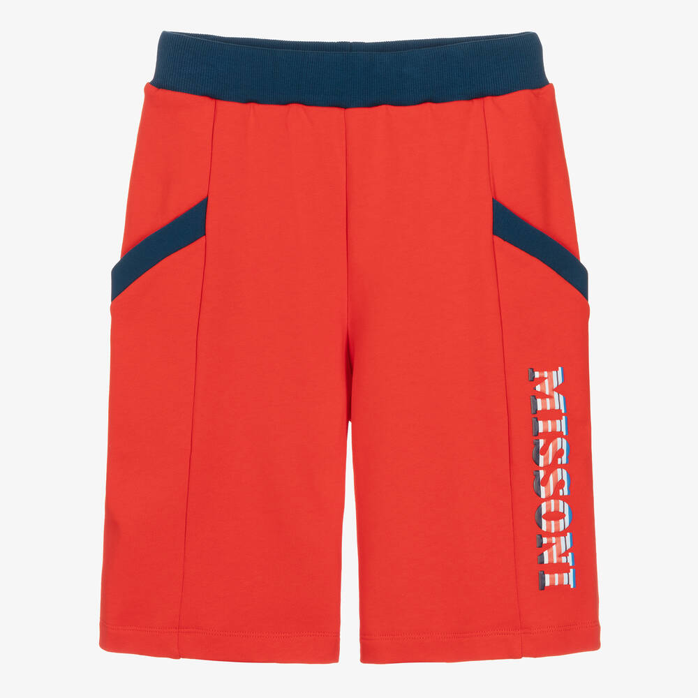 Teen boys red jersey shorts by luxury Italian designer Missoni, instantly recognised with striped logo lettering on one leg. Ideal for casual days, these mid-weight organic cotton shorts have navy blue trims for a more sporty aesthetic. They have an elasticated, ribbed waistband and roomy front pockets to keep essentials within reach.