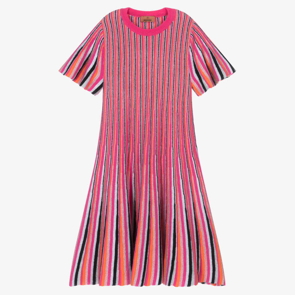 A statement knitted dress for teen girls by iconic Italian brand Missoni, in vibrant pink, orange, black, and metallic silver stripes. Fitted at the bodice with elegant fluted sleeves, the skirt beautifully flares out towards the hem to create a stunning silhouette. Combining luxury and comfort, the soft, ribbed knit is made in a sumptuous blend of mohair, wool and viscose.