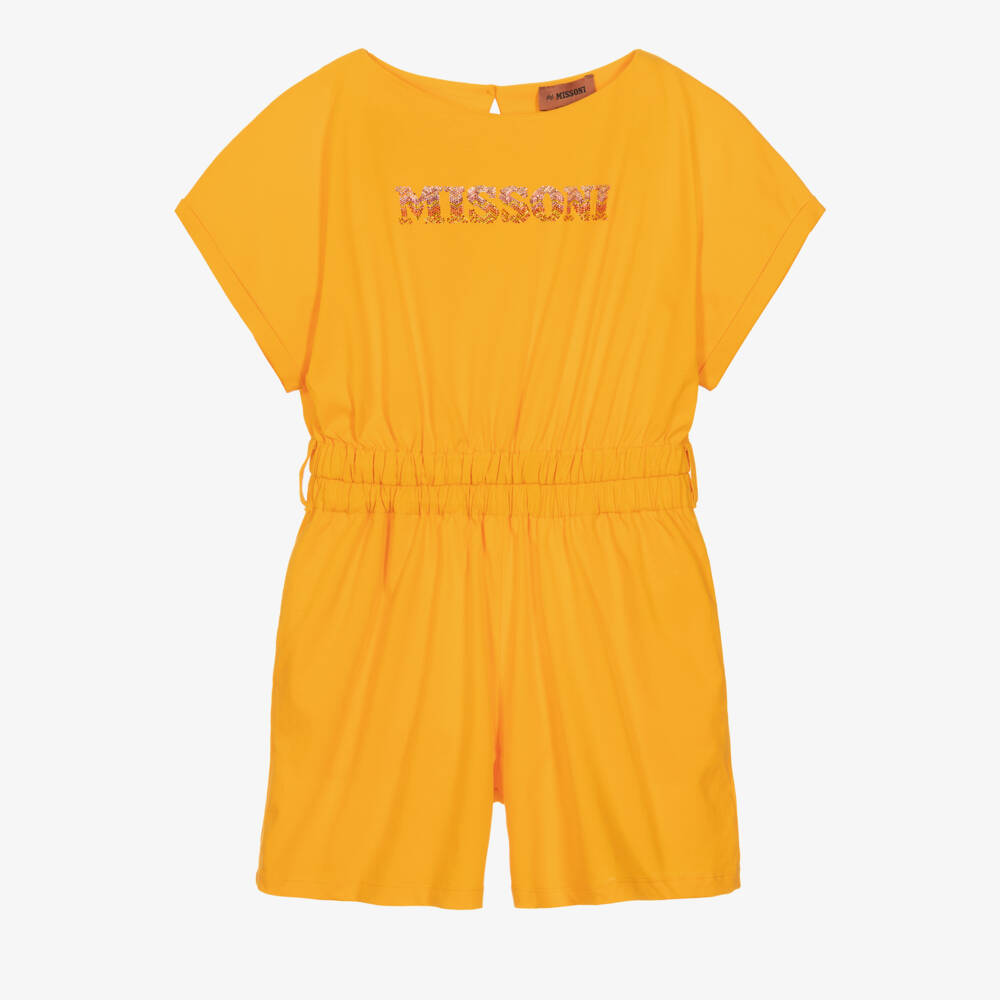 From luxury brand Missoni, a striking orange playsuit for teen girls with a diamanté logo appliqué on the chest. The elasticated waist creates a cinched-in silhouette for a glamorous beach-bound look. Part of the sun-inspired beach capsule, this lightweight cotton jersey playsuit is comfortable as well as stylish.