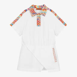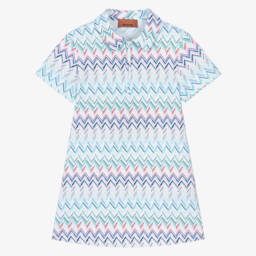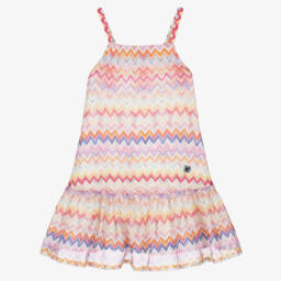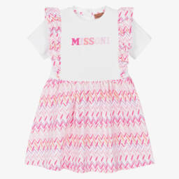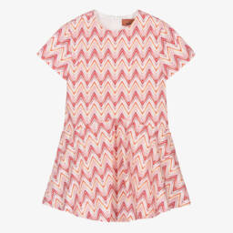 Stylish for casual wear, a pink jersey T-shirt dress for teen girls by Italian fashion house Missoni. Designed to make a statement, the luxury brand's iconic logo is decorated in a colourful bouclé design. Made in organic cotton, the crew neck is styled in a darker pink and the back has an open cut-out detail with elasticated trims.