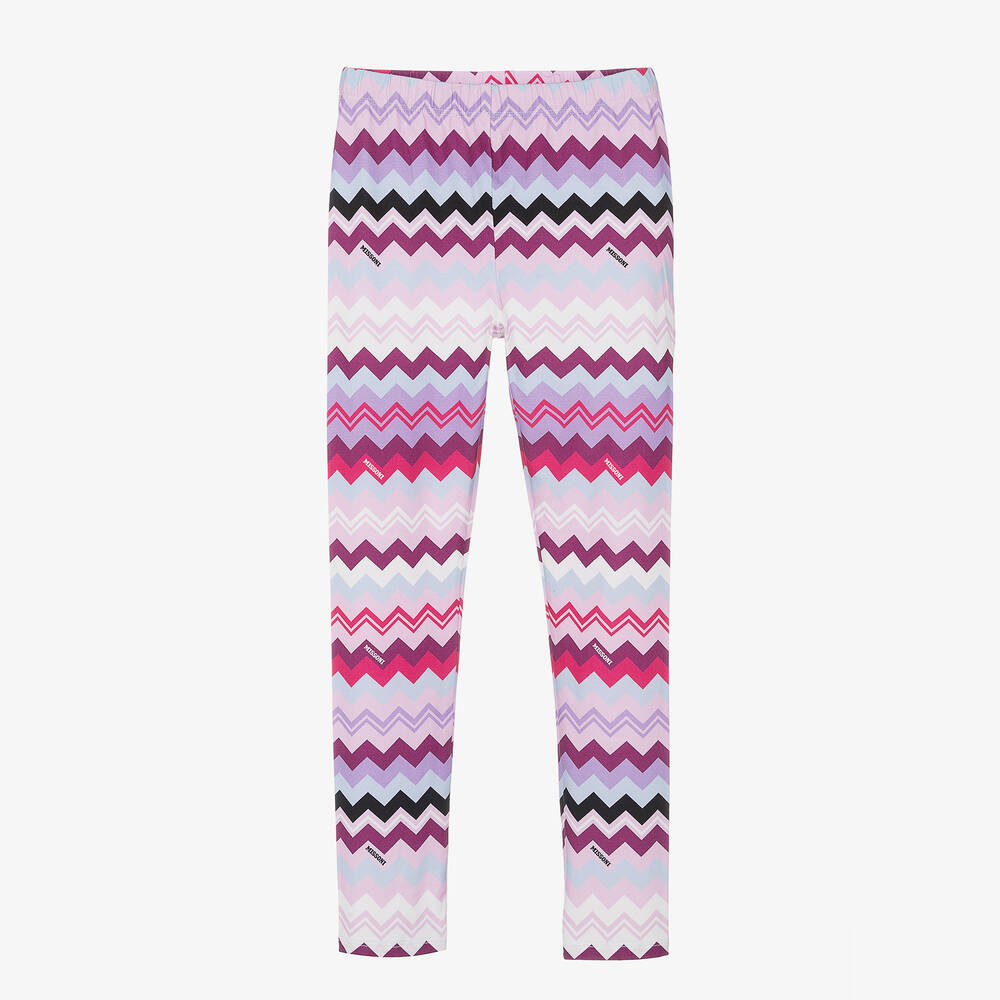 An iconic pair of purple, pink and blue leggings for teen girls by luxury Italian label Missoni, designed in their instantly recognisable zigzag pattern. Ideal for casual days, these full-length leggings are made from soft and stretchy cotton jersey with a comfortably, elasticated waist. A subtle logo design can be seen within the print for an added designer stamp.