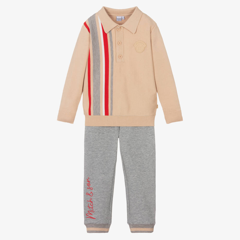 Casual beige and grey trouser set for younger boys from Mitch & Son. The beige polo-style top is softly knitted and patterned with red, grey and white stripes on one side. It has a classic ribbed collar, cuffs and hem, and fastens with branded buttons. It pairs with comfortable grey joggers, made in soft cotton-blend jersey. They have coordinating grey and beige ribbed trims, an adjustable drawstring waist and front pockets. For a branded look, the top has a rubberised logo patch on the chest and the joggers have a red script logo print on one leg.