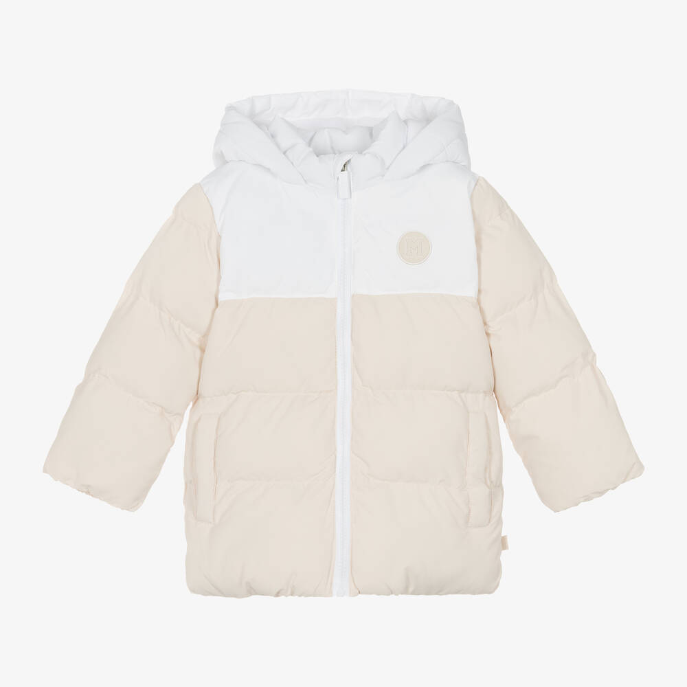 Designed in pale beige and white, this hooded puffer coat for younger boys is by Mitch & Son. Made in silky smooth fabric, this padded outerwear piece has a front zip fastening and fleece-lined pockets to keep hands warm in cooler temperatures. It has a fleecy lining and gently elasticated cuffs to help keep chilly winds out. There is a beige logo badge on the chest and a protective zip guard on the neckline.