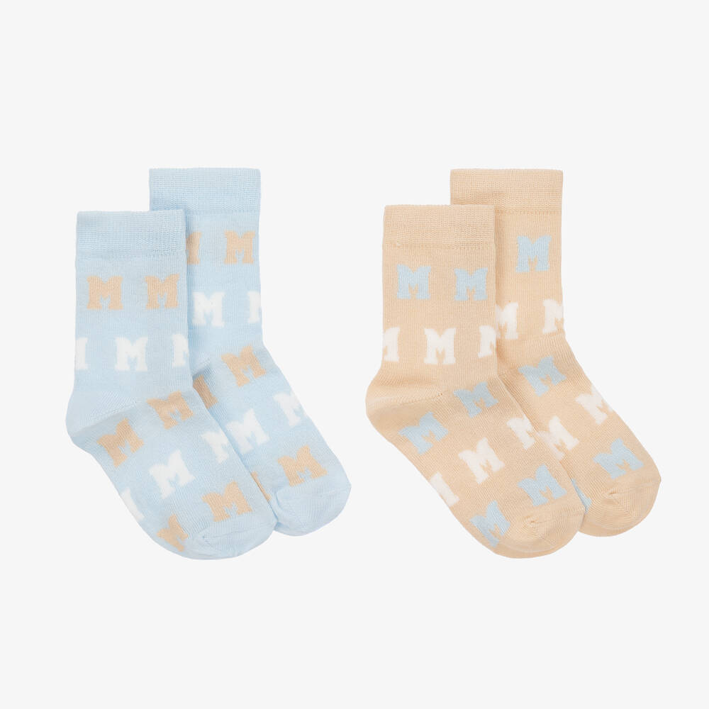 Pale blue and beige socks for little boys by Mitch & Son, in a useful pack of two. Knitted in a comfortable cotton blend, both pairs are patterned with monograms in contrasting shades for a branded look.