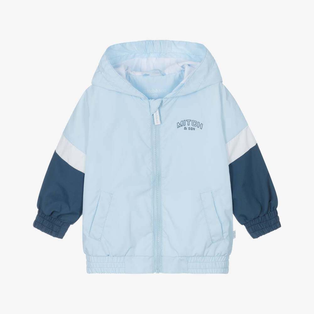 Cool, blue and white colourblock windbreaker jacket for younger boys by Mitch & Son, with logo branded accents. Practical and lightweight for cooler days, this hooded zip-up style has a comfortable jersey lining, hand pockets and elasticated trims to help keep the chill out.